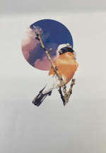 Bullfinch is an A3 CMYK, fully registered screen print that presents a strikingly photorealistic bullfinch set against a dreamy cloudscape. The bird’s vivid, fiery-red breast stands proudly against soft pink skies, creating a bold and impactful composition that draws the eye and lingers in memory.