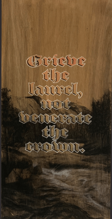 This collaborative piece by Larna and Jonathan was created for the Meander exhibition at Sussex Contemporary. Drawing on the myth of the nymph Daphne—who was transformed and erased when Apollo pursued her—the work reflects on themes of identity, power, and loss. It comments on how Daphne’s selfhood was consumed, absorbed into Apollo’s narrative and symbolised through his laurel crown.