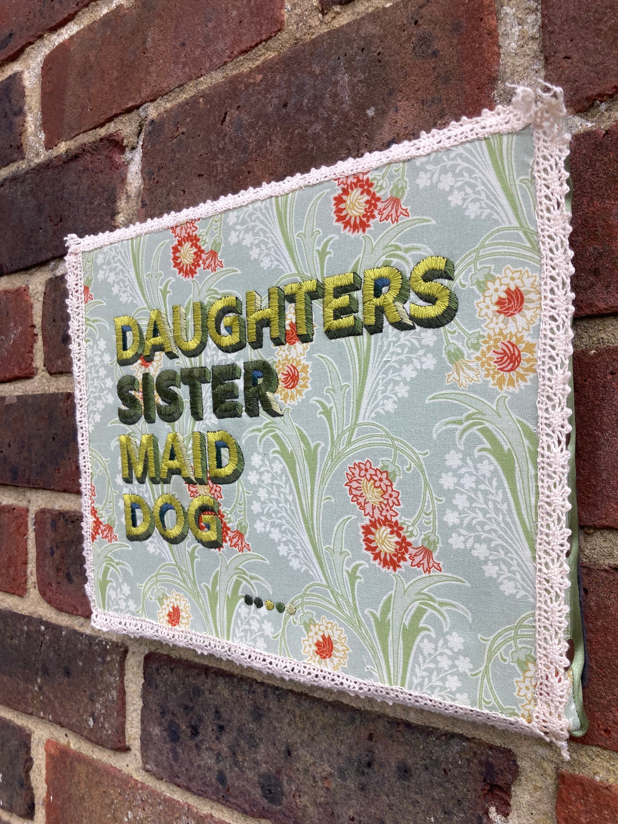 The phrase “Daughters, Sister, Maid, Dog” refers to documented accounts of abuse. "Sister" is stitched in a different colour, reflecting ongoing uncertainty—was it one sister, or both? That lack of clarity is part of the violence, part of what remains obscured even now.