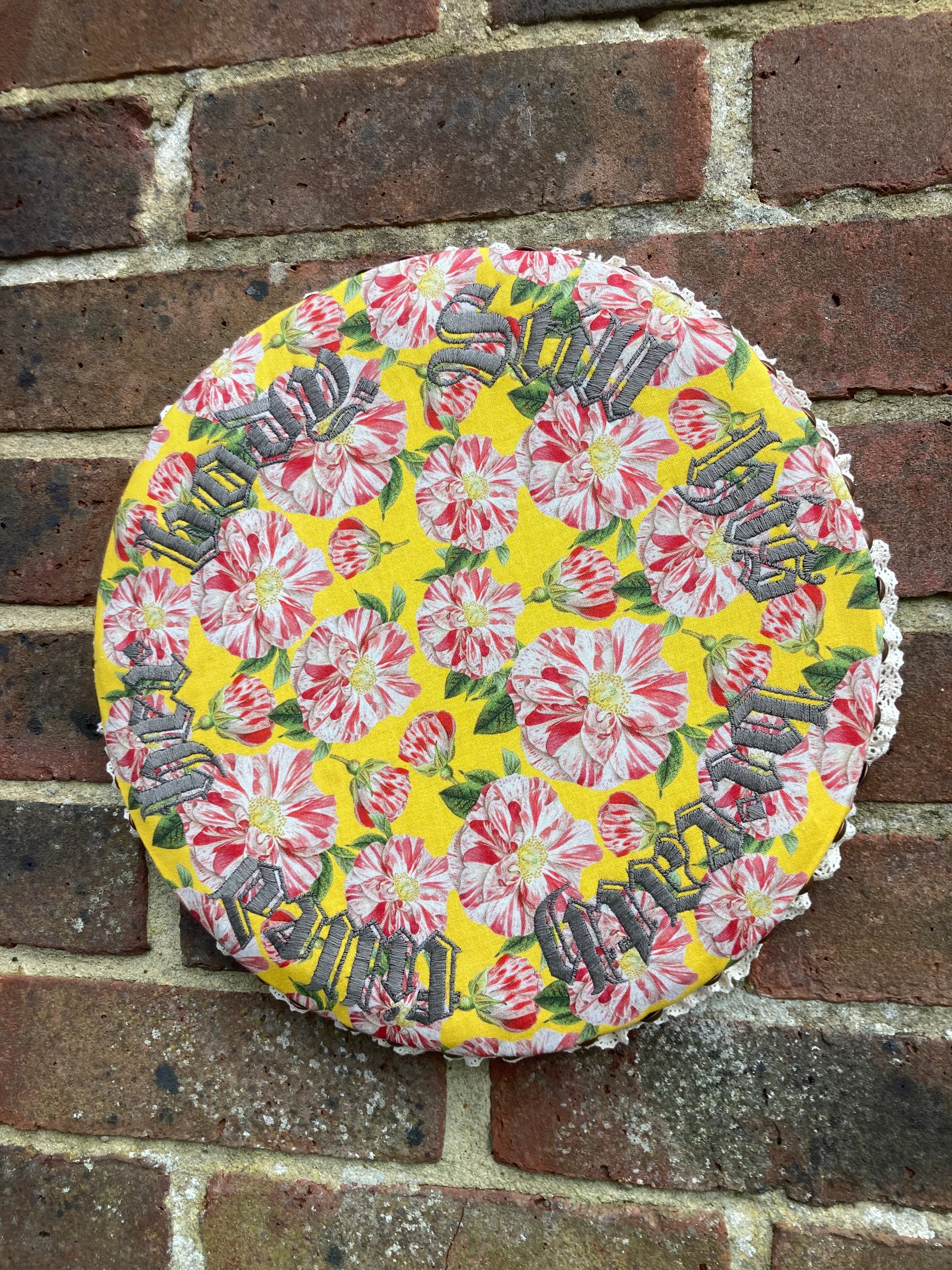 All are printed on a selection of vintage floral fabrics (often Laura Ashley, RHS, or similar botanical patterns), each piece becomes a blend of classical beauty and quiet rage.