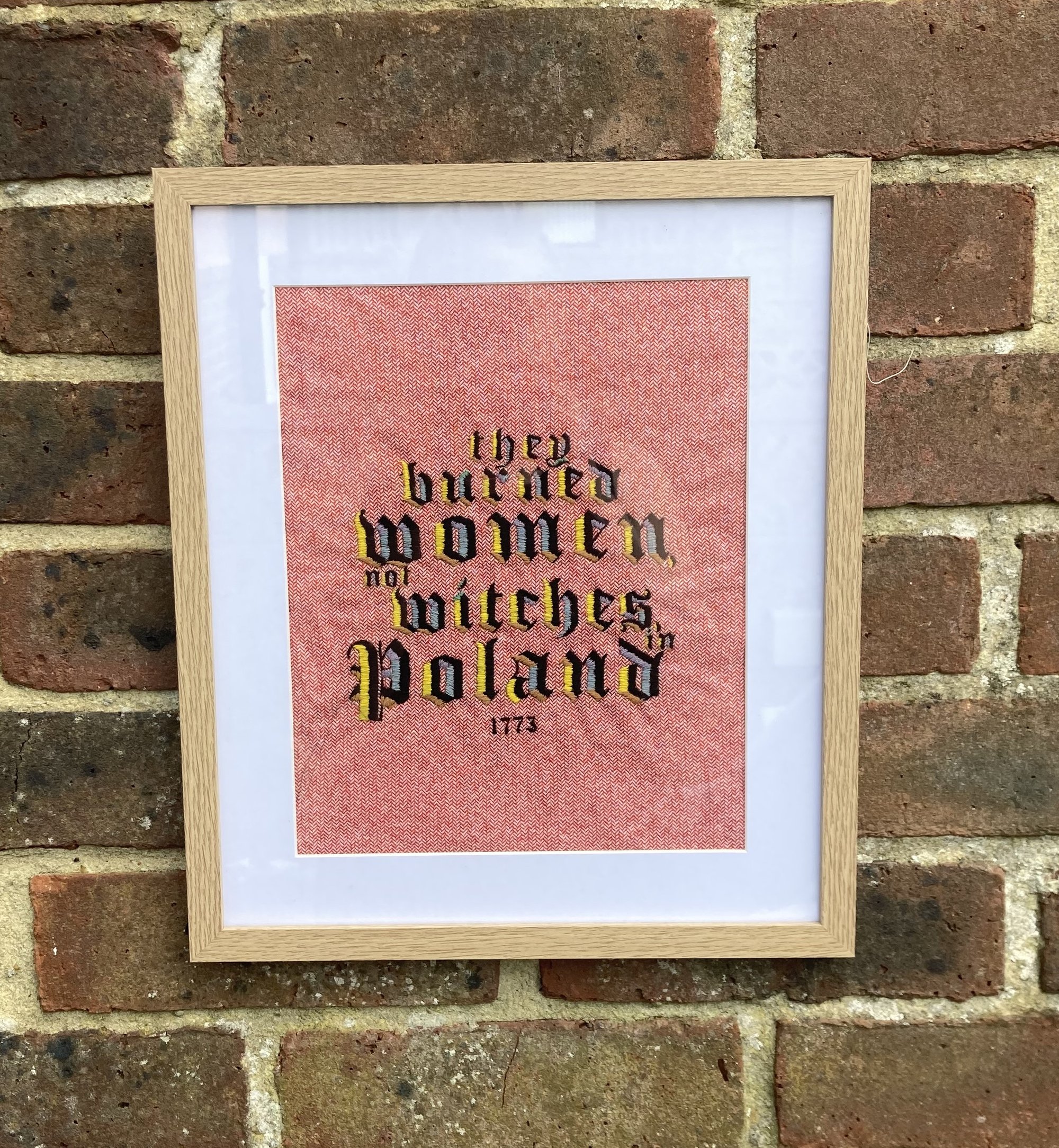 This hand-stitching sampler confronts a dark and often sanitised part of history: the witch trials. In particular, it focuses on Poland, where witch hunts began later than in most of Europe but lasted significantly longer.